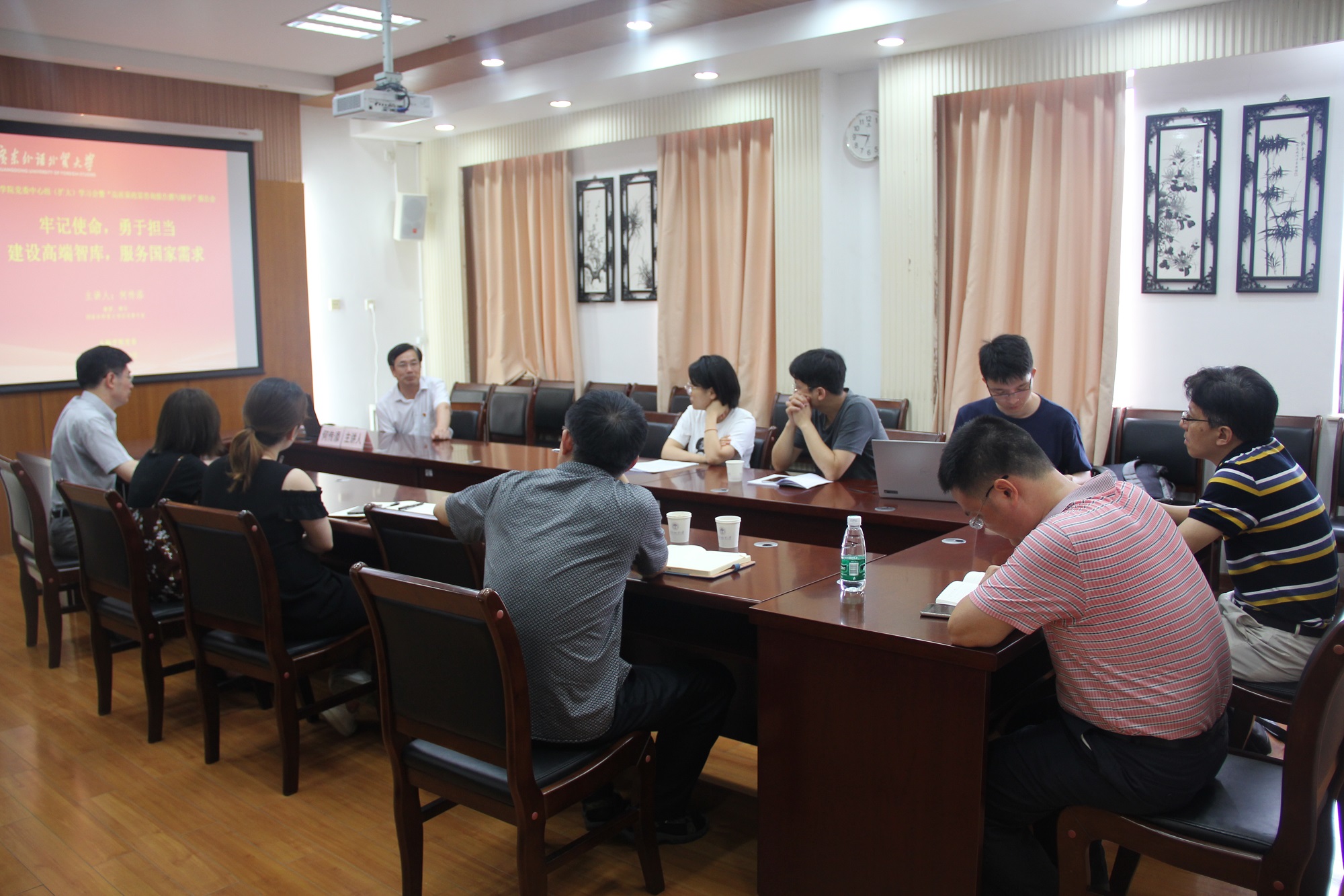 本网讯 7月3日上午,金融学院党委中心组(扩大)学习会暨“高质量政策咨询报告撰写辅导”报告会在院系办公楼401举行,会议邀请学校党委常委、副校长何传添做题为“牢记使命,勇于担当,建设高端智库,服务国家需求——如何撰写高质量政策咨询报告”的专题讲座。本次学习会的目的在于更好地响应国家号召,激励学院教师更好地担当使命、做出贡献,进一步提升决策咨询能力以更好地服务国家需求。金融学院党政领导班子成员,广州华南财富管理中心研究基地成员、云山学者及学院党员教师代表参加学习会。