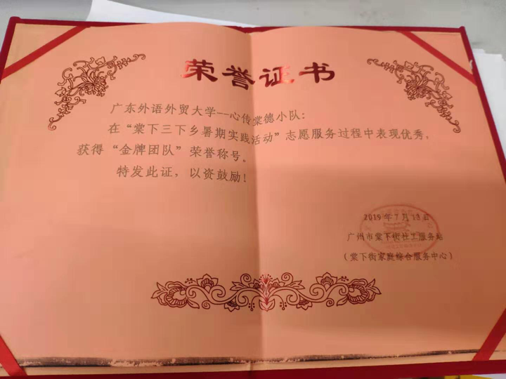 “心(新)传棠德服务队”的队员们团结友爱、合作高效,为棠下社区的良好建设发挥了作用,获得了社区服务站颁发的“金牌团队”的荣誉称号。