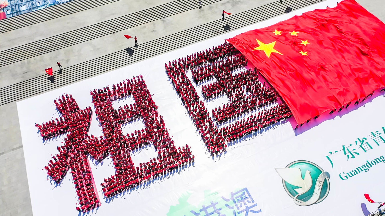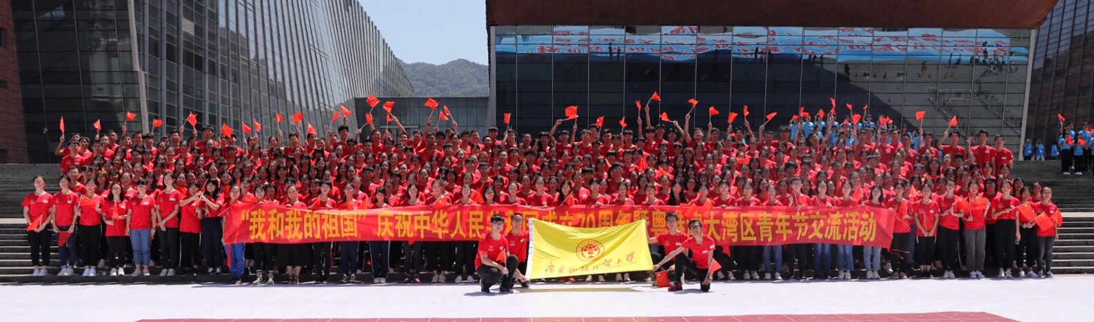 本网讯 9月22日上午,由广东省青年联合会、粤港澳大湾区青年总会主办的“我和我的祖国”庆祝中华人民共和国成立70周年暨粤港澳大湾区青年节交流活动在广州白云国际会议中心广场举行。我校组织340名青年学生参与主题活动,参加升旗仪式,摆拼出“祖国好”三个大字矩阵。经贸学院、信息学院派出38名学生承担传递巨幅国旗的任务,长80米,宽42米的巨幅国旗由我校学生托举,稳稳地划过方阵,来自粤港澳三地青年放声高唱《歌唱祖国》,表达对新中国成立70周年的深情祝福。共青团广东省委书记池志雄,香港广东各级政协委员联谊会首席会长戴德丰,粤港澳大湾区青年总会主席吴学明等嘉宾出席,粤港澳三地约3000名青年代表参加。