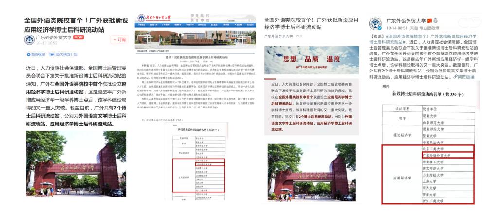 本网讯 近日,我校在全国外语类院校中首个获批设立应用经济学博士后科研流动站引起众多媒体关注,人民日报社、人民网、中国日报网、光明网、南方plus、南方网、羊城晚报、新快报等中央及省内知名媒体纷纷发布新闻,聚焦我校学科发展这一重大突破。此外,学校新闻网、官方微信、微博、南方号等校园媒体新闻报道也引起广大师生校友关注。
