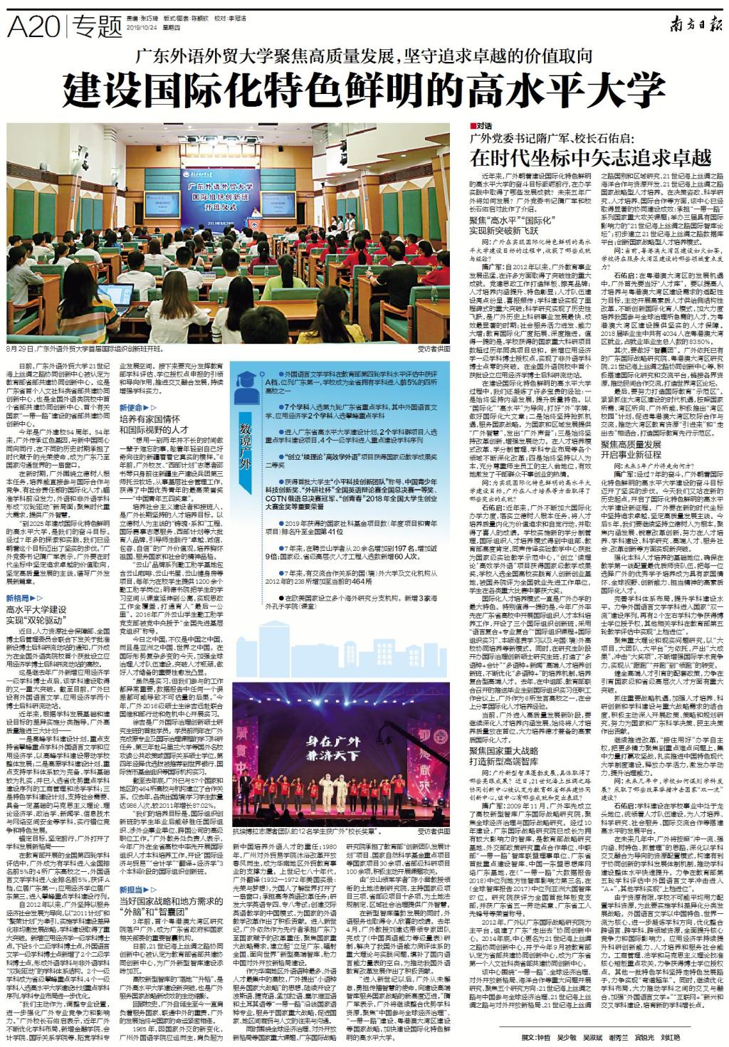 编者按 凝心聚力迎盛会,奋发有为绘新篇。10月24日,在我校第四次党代会即将召开之际,《南方日报》刊发关于我校的专版报道《广东外语外贸大学聚焦高质量发展,坚守追求卓越的价值取向——建设国际化特色鲜明的高水平大学》,历数我校自第三次党代会以来的发展成就,聚焦学校未来发展方向,受到社会各界和广大师生校友热切关注。