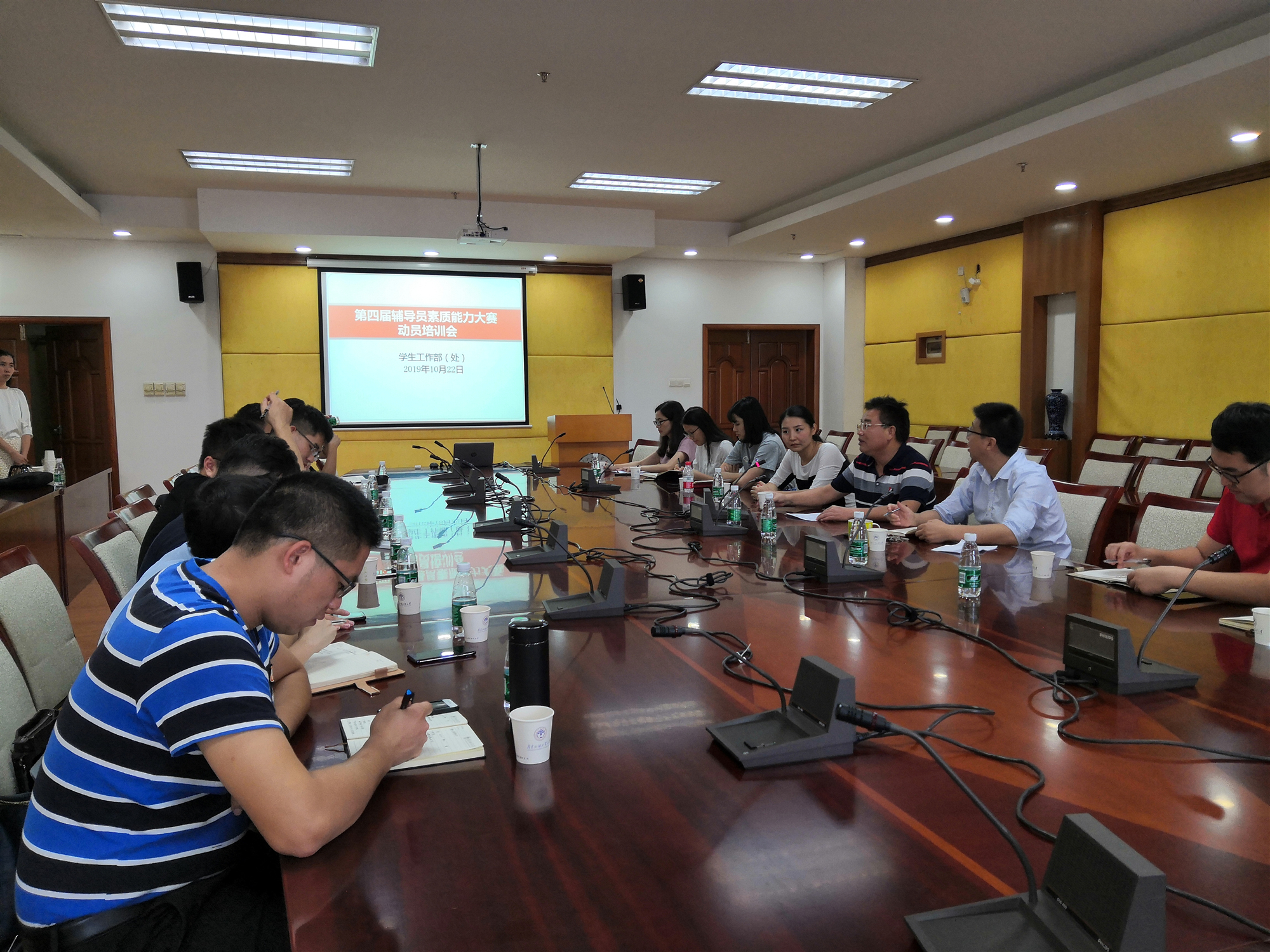 本网讯 为做好辅导员素质能力大赛的备战工作,进一步提升辅导员职业能力和专业素养,10月22日,学生工作部(处)在南校区校办公楼第一会议室举行第四届辅导员素质能力大赛动员培训会,对报名参加我校第四届辅导员素质能力大赛的13名辅导员进行专题培训。通过赛事举办和相关培训的开展,我校将真正实现以赛促学、以赛促建的目标,从而促进辅导员队伍素质能力的进一步提升。