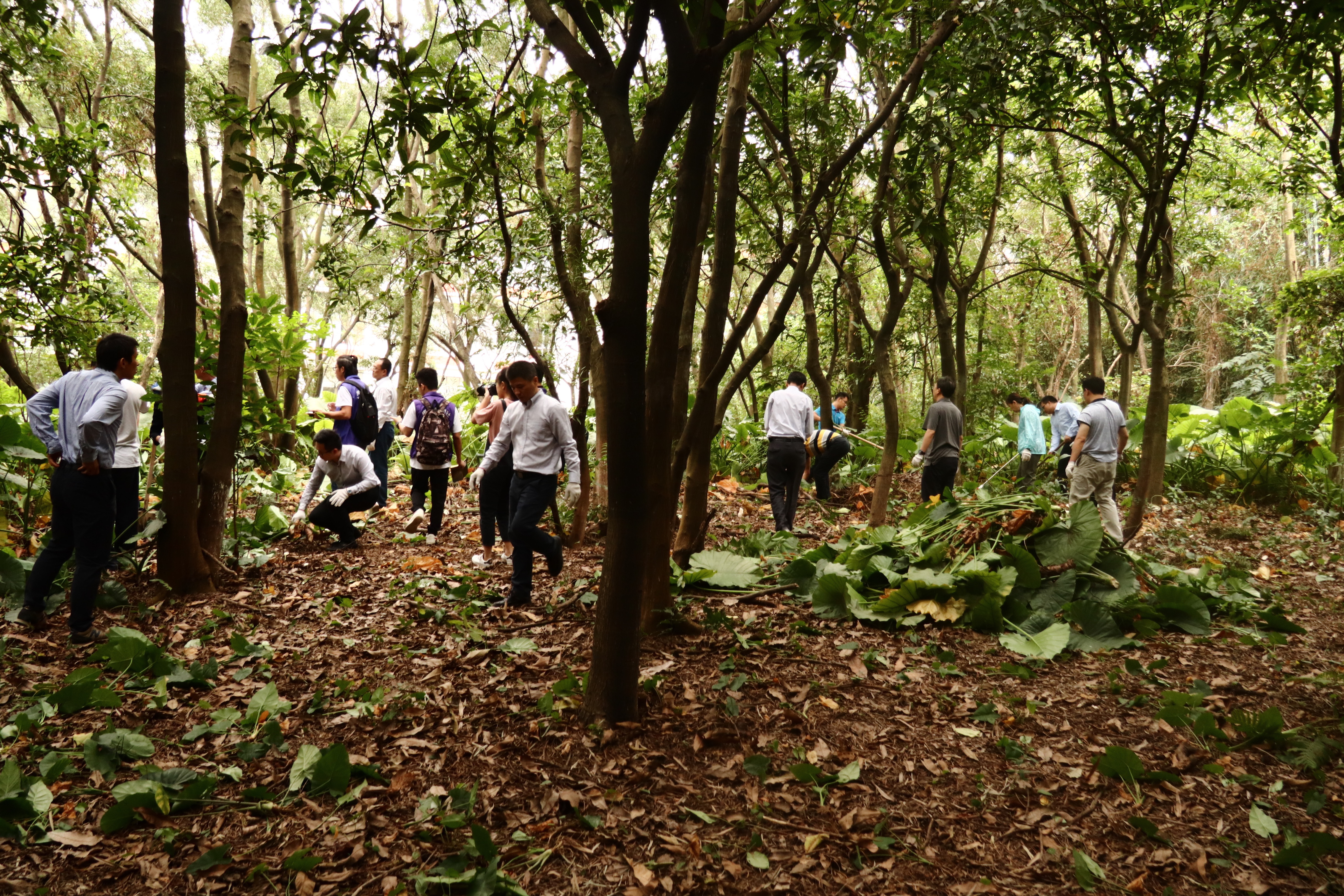 锄杂草、扫落叶、拾垃圾、搬枯枝,劳动现场一片热火朝天。隋广军一行专注地带头铲除易滋生伊蚊的潮湿杂草。随着锄头的一起一落,现场众人挥汗如雨。在校领导的带领下,大家高效率、高质量地将凤凰山的杂草落叶清除完毕。
