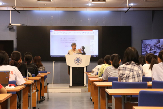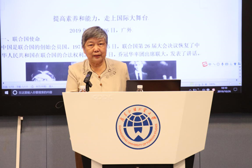 本网讯 10月26日晚,我校国际组织专题讲座课程在北校区六教A209、南校区E301开讲。主讲人是联合国大会和会议管理部文件司中文处原处长、中国外交部翻译室原主任、全国翻译资格(水平)考试英语专家委员会资深专家、中国翻译协会常务理事(专家会员)、中国前驻特立尼达和多巴哥共和国大使徐亚男。国际组织专题讲座是由教务处牵头落实的第一门国际组织特色课程;由有丰富国际组织工作经历和招聘经验的专家作时长三小时的“第一讲”;第一次在南北校三个国际组织创新班实现南北校同步、全程互动讲座。