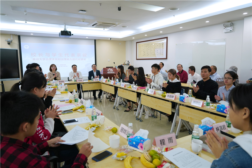本网讯 11月12日,校长与学生代表茶叙活动在教师发展中心105会议室举行。我校校长石佑启与来自南北校区各学院的20名本科生、硕士生、博士生代表围绕“推动大学治理体系和治理能力现代化建设”的主题,聚焦学校教学、科研、管理、服务等多层面多领域进行交流。这也是我校为深入推进“不忘初心、牢记使命”主题教育、广泛听取意见、认真检视问题而开展的特色活动之一。