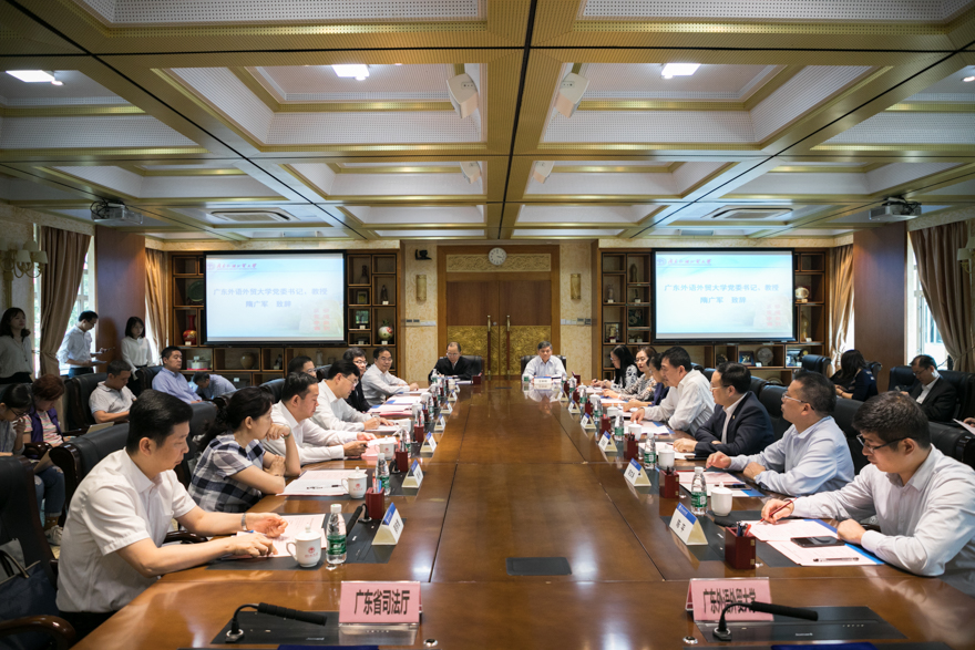本网讯 11月13日下午,广东涉外法治人才培养基地揭牌仪式在北校校区举行。广东涉外法治人才培养基地由广东省司法厅与广东外语外贸大学合作共建,着重发展壮大我省涉外法治人才队伍,切实提升我省涉外法治人才的专业化、职业化水平,打造广东涉外法治人才高地,率先形成具有国际竞争力的涉外法治人才制度优势,为我省经济高质量发展和构建全方位对外开放新格局提供人才支撑和智力保障。广东省司法厅党委书记陈旭东、厅长曾祥陆,副厅长梁震,广东省律师协会会长肖胜方,我校党委书记隋广军,校长石佑启,副校长王廷惠出席揭牌仪式。仪式由石佑启主持。