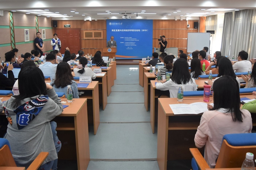 在第一环节,张平以《高质量转型与湾区产融结合》为题,通过对比中国“工业化”、“城市化”发展特征差异,提出深度城市空间集聚和湾区产融合作的构想,并阐述了基于“人”的技术进步和分布式创新协调发展的机制探索。刘霞辉围绕中美贸易摩擦的现实背景,就《面向未来的中国经济问题》的主题进行了发言。他介绍了税制征缴体制完善和政府行为重构、职能转化的现实要求,详细阐述了区域均衡发展的前进路径。林桂军从《改革服务业,促进湾区升级发展》的主题切入,对标分析了粤港澳地区城市经济数据,以时间为轴梳理了城市身处不同时代具有的职能特征,强调湾区发展应以劳动生产率为目标。孙久文以《到达发展中期的新经济地理学》为题,从学科交融性的角度介绍了新经济地理学发展路径,阐述其在新时代背景下具有的模型优势,为空间问题研究的现实问题提供了创新思路。我校粤港澳大湾区研究院院长申明浩在《协同发展-跨界跨境合作新动能》的主题报告中,通过回顾两次大规模经济整合和对外贸易依存度的变化,系统分析了创新生态系统高质量协同发展的路径,强调我国应探索湾区中国模式创新路径。