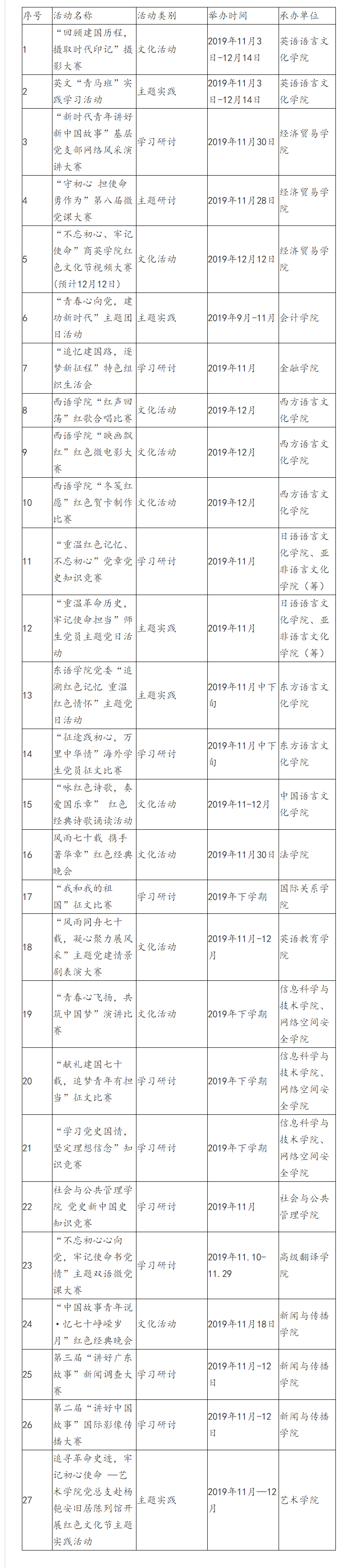 王廷惠在致辞中表示,广外是一座红色基因强大、革命传统深厚的大学,学校立足于立德树人的根本任务,在充分结合办学特色的基础上,挖掘学校历史文化资源,充分彰显和传承广外的红色基因。红色文化节能让学子深刻领会实现中华民族伟大复兴的历史意义,激励学子坚持党的领导、自觉担当、勇挑重任,用所学为实现中华民族伟大复兴而努力奋斗。胡文涛在介绍第二届红色文化节方案时表示,本届红色文化节时间从11月持续至12月,活动覆盖全校16个单位,共计开展26项丰富多彩的活动。法学院红色经典晚会历史悠久,自2005年至今传承14年,风雨无阻、从未中断。