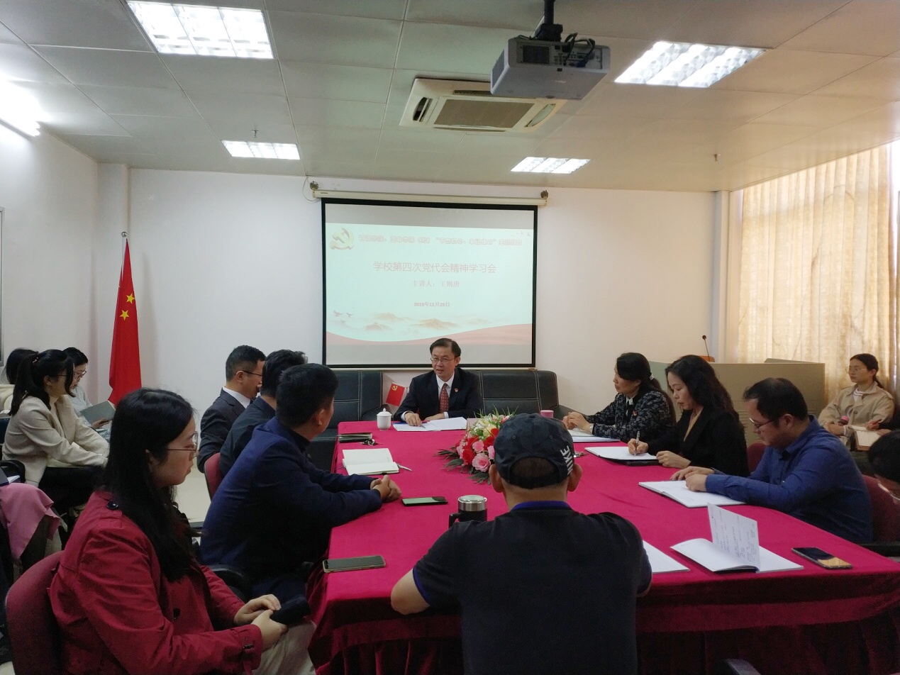 本网讯 为学习贯彻学校第四次党代会精神,继续推进“不忘初心、牢记使命”主题教育,11月29日下午,日语学院、亚非学院(筹)在北校区七教607会议室举行学校第四次党代会精神学习会,特邀校党委委员、学校第四次党代会精神宣讲团成员、法学院党委书记王则唐进行学校第四次党代会精神解读,学院领导班子成员、系(办)主任和各专业负责人、全体辅导员和行政人员、师生党支部书记及支委等参加学习会。
