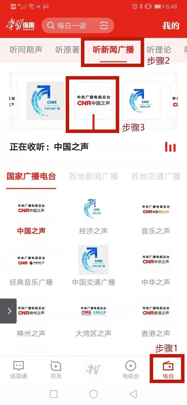2.步骤1:选择“电台”——步骤2:选择“听新闻广播”——步骤3:选择“中央广播电视总台中国之声”