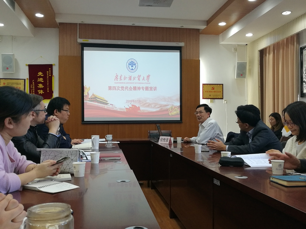 何传添从七个方面回顾了我校自第三次党代会以来的工作经验和辉煌成就,指出了目前的主要问题和存在的差距,分析了当今新时代环境下我校发展形势和发展目标,阐明了开启国际化特色鲜明的高水平大学建设新征程的愿景。同时,他详细讲解了学校第四次党代会工作报告中提出的“六个必须坚持”,即坚持党的全面领导,坚定办学方向;坚持内涵发展,提升质量特色;坚持潜心作为,注重久久为功;坚持抓住机遇,服务国家战略;坚持改革创新,增强发展动力;坚持以人为本,形成整体合力。他指出新时代的我们承担着超越历史为实现中国梦的新征程贡献广外力量的新使命,并着重讲解了卓越人才培养、卓越学科引领、卓越师资引育、卓越开放合作、卓越文化建设和卓越治理体系等“六项卓越工程”,旨在引领鼓励师生不断推动学校建设,将我校建设成为国家满意、人民满意、社会满意的国际化特色鲜明的高水平大学。