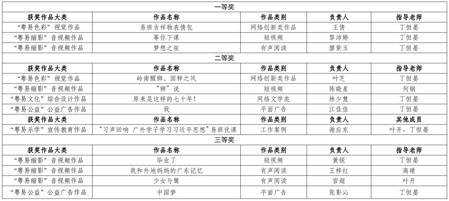 本网讯 近日,广东省教育厅发布《广东省教育厅关于公布第四届广东高校优秀网络文化评选结果的通知》,我校共有12项作品在此次评选中获奖。其中获“粤易色彩”视觉作品一等奖1项,二等奖1项;“粤易缩影”音视频作品一等奖2项,二等奖1项,三等奖3项;“粤易文化”综合设计作品二等奖1项;“粤易公益”公益广告作品二等奖1项,三等奖1项;“粤易乐学”宣传教育作品二等奖1项。我校获得优秀组织奖。