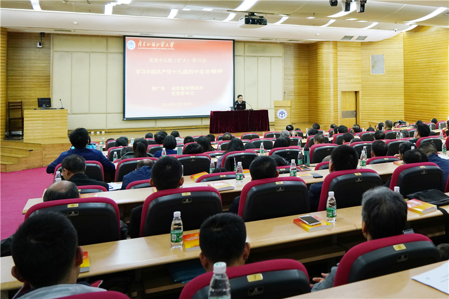 本网讯 12月19日,我校在北校区图书馆报告厅举行党委中心组(扩大)学习会。学习贯彻党的十九届四中全会精神省委宣讲团专家、我校党委书记隋广军作专题报告。会议由校党委副书记、纪委书记刁振强主持,校领导、校党委委员、纪委委员,学校副处职(级)以上干部参加学习。