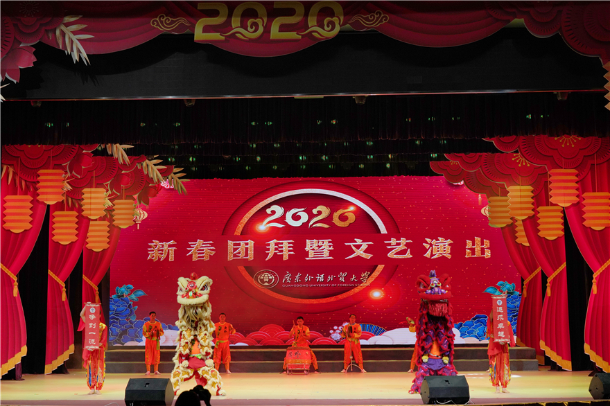 保卫处舞狮队带来气势恢宏的舞狮表演《雄狮贺新春》,经隋广军、石佑启点睛后的醒狮上下翻腾,在观众的欢呼声中传递了对新年的美好祝愿;艺术学院2018级舞蹈专业学生带来了开场舞《盛世欢歌》,飘扬的丝带、火红的灯笼、激昂的鼓声、腾空的姿态将新年的喜庆传递给在场的每一位观众;我校教师填词作曲、艺术学院教师蔡静雯独唱的《蒲芦歌》唱出了我校助力蒲芦洲脱贫致富的努力与深情。阳山县岭背镇蒲芦洲村党总支部书记、村委会主任欧木养也被邀请来到了团拜现场。他向我们讲述了蒲芦洲近年来脱贫攻坚取得的成绩,表达了对学校的感谢和打赢脱贫攻坚战的决心。