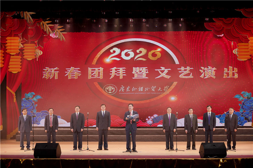 隋广军代表校领导班子致辞。他表示,过去这一年,在全体广外人的共同努力和辛勤耕耘下,学校各项事业取得了可喜进步。这一年,我们扎实开展“不忘初心、牢记使命”主题教育,切实“为民服务解难题”,“线上办事大厅”上线运行, A级饭堂成功申报,科研楼完成改造,第一教学楼重建工程将于今年9月底完工。广大师生的幸福感、获得感更加真切。这一年,我们胜利召开第四次党代会,科学谋划未来发展新航向、新路径,重点实施“六大卓越”工程,开启国际化特色鲜明的高水平大学建设的新征程。这一年,我们实现了许多新突破、新跨越。学校首次进入QS亚洲大学排名500强;应用经济学博士点首次招生、并获批博士后科研流动站;国家社科基金项目数排名跃居全国第41位,21世纪海上丝绸之路协同创新中心成为全国首个有关国家“一带一路”建设的省部共建协同创新中心;22个专业获批国家级一流本科专业建设点,在广东省所有高校中排名第三,在全国外语院校中位居第二;学校在省内率先开设国际组织本科创新班;全国首家涉外律师学院落户广外,粤港澳三地共建湾区校园项目正式起航。他强调,2020年是全面实现小康社会的决胜之年、“十三五”规划的收官之年,也是学校发展新征程全面开启之年、建校55周年的喜庆之年。让我们只争朝夕,不负韶华,以一流的业绩和卓越的成就、书写广外教育事业崭新的篇章。