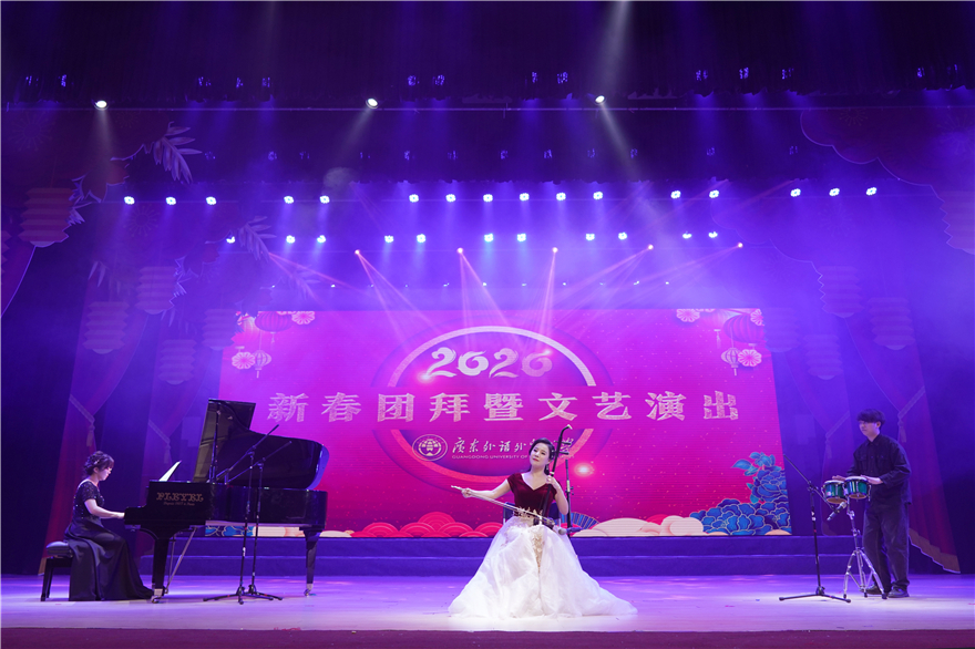 由我校教师李林静和广外体育舞蹈队队员带来的体育舞蹈《火花》旋律明快、动感十足,表达了广外人积极奋进筑梦美好未来的愿景;而由离退处带来的舞蹈与模特秀《草原的月亮》则充满草原风情,在悠扬的乐声中老师们动作舒缓优雅,给在场观众留下深刻印象;我校教师刘贝妮、魏陶影、曾扬辉带来的《花儿为什么这样红》用二胡、钢琴和独具少数民族特色的手鼓碰撞出了美妙的乐章,给经典音乐注入了新的活力,为全校师生及全球校友送上了新年的祝福。