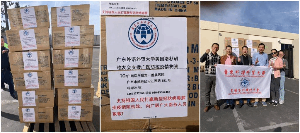 在全国人民一起全力防控疫情蔓延的时候,身处洛杉矶的广外校友也密切关注着疫情的变化。在得知许多医院严重缺乏防护物资的情况下,广外洛杉矶校友会会长伦炳强等于1月24日发起捐款捐物倡议,在不到一天的时间里,爱心校友们已捐出了7000多美元,截止2月1日,已经募集了10300美元。此外,1月31日,洛杉矶校友会还连同校友企业,通过UPS将26400个口罩直接发送到急需的广州医科大学第一附属医院,支持日以继夜、不顾安危工作在第一线的医务人员,支持祖国打赢疫情防控阻击战。