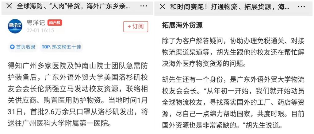 本网讯 近日,陆续发生新型冠状病毒感染的肺炎疫情,牵动全国人民的心。面对抗击疫情这场没有硝烟的战争,广外洛杉矶校友会、物流校友会等多个校友组织发挥各自资源和专业优势,发起募集物资、建立物流通道,支援疫情防控,广外校友的义举受到媒体的高度关注。