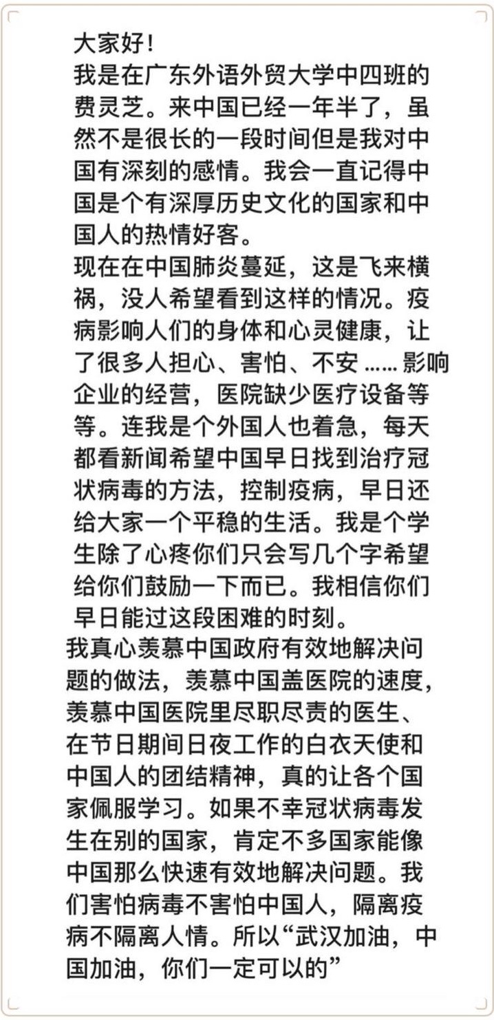 面对来势汹汹的疫情,我校另一位留学生费灵芝(中文名)也发声表示愿与中国同在,坚定地相信、支持中国。