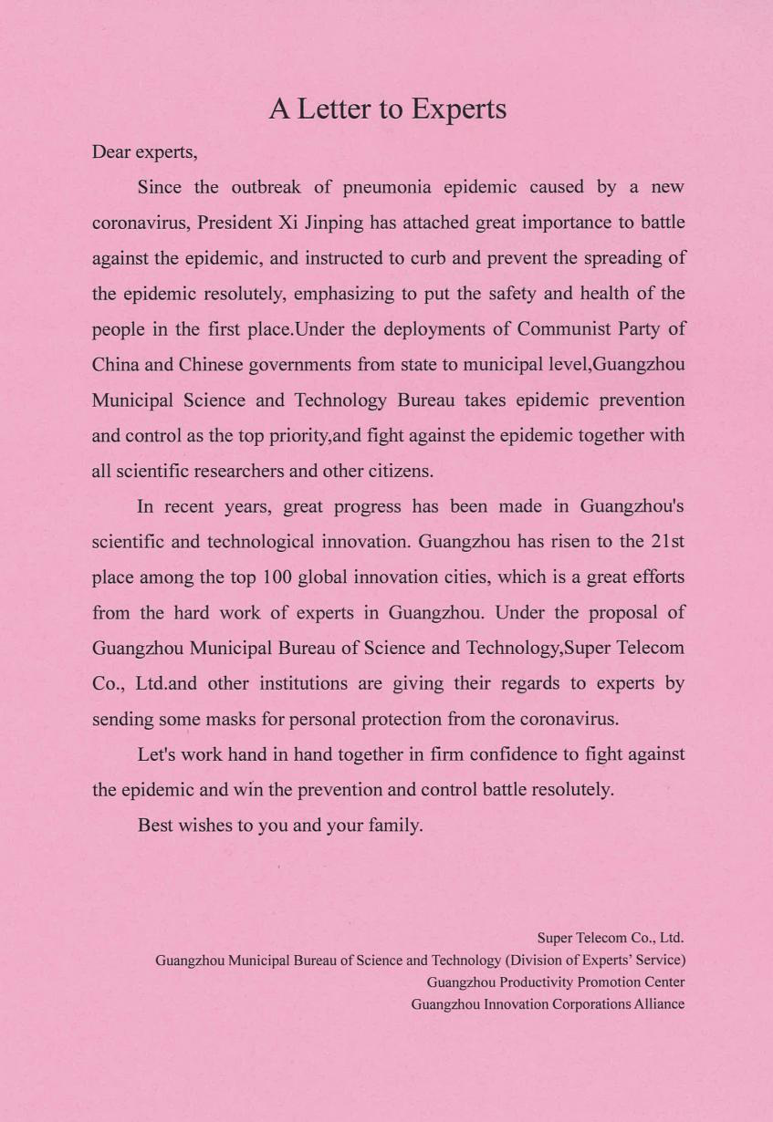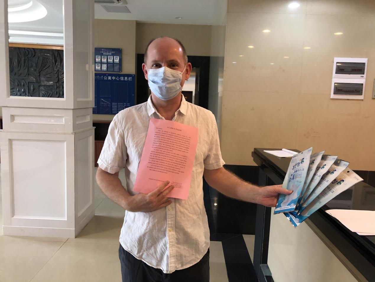 近期,新冠病毒肺炎疫情防控形势严峻,全国上下众志成城、严防死守,全面打响疫情防控阻击战。在当前个人防护物资相对匮乏,尤其是在防护口罩“一罩难求”的情况下,省科技厅送来的一批口罩,解决了我校留校外教的“燃眉之急”。与口罩一同送来的还有省科技厅外国专家处《给外国专家的一封信》,字里行间都流露着对留校外教的叮咛与关怀。