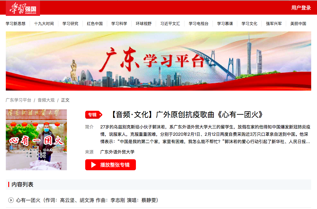 歌曲《心有一团火》以我校乌兹别克斯坦大三留学生郭沫若在中国爆发新冠肺炎疫情后,克服重重困难,两次采购口罩并亲自送到中国的故事为创作背景,歌颂了在抗击疫情期间,包括广外的外国留学生、海外校友会、海外孔子学院、海外合作院校等在内的组织和个人,通过各种渠道和方式,向中国伸出无私援助之手的大爱精神,他们的事迹如一团大爱无疆之火,感动了中国!