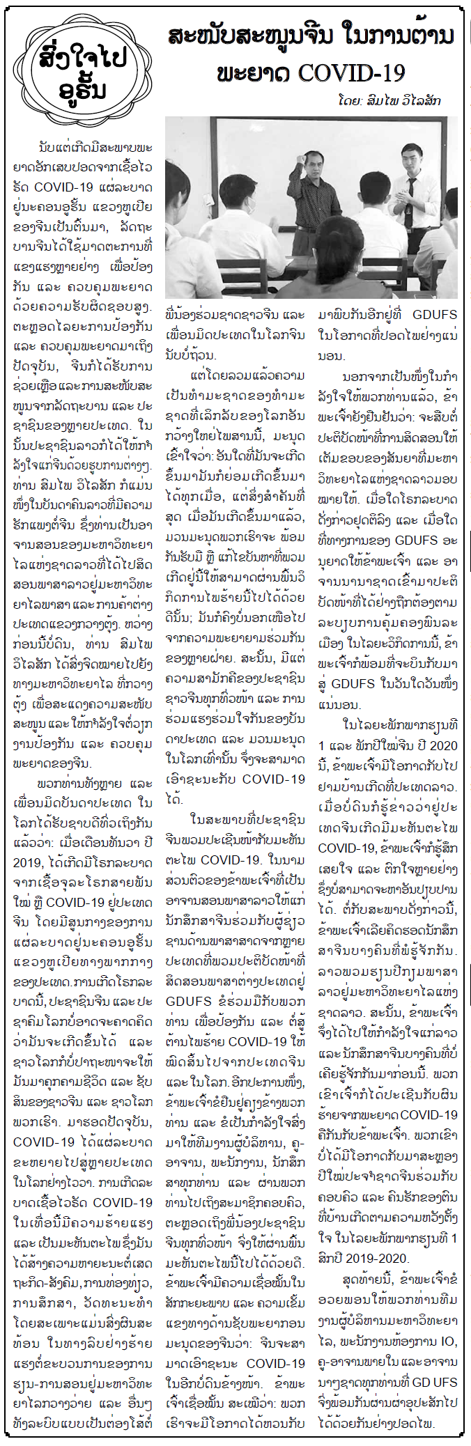 老挝人民革命党中央机关报ໜັງສືພິມປະຊາຊົນ相当于我国的《人民日报》,是老挝发行量最大的报纸。宋派·维莱是我校东方语言文化学院的一名老挝语外教,当前在中国举全国之力团结一致抗击疫情的同时,我校国(境)外教师时刻与中国人民坚定站在一起,他们纷纷通过学校国际合作与交流处以及所在学院,及时了解中国抗击疫情的进展,并表达他们对中国人民、对广外的关切和支持,一次次让广外师生真切感受到“病毒无国界,患难见真情”。
