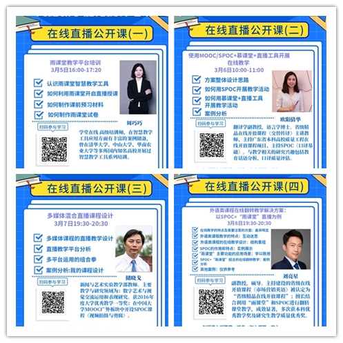 人事处、教师发展中心联合教务处、网信中心推出在线教学能力培训系列课程,推出在线直播公开课、精选在线教学平台使用技术培训、教学案例分享、教学模式策略、教学理念、心理防护等方面的在线培训资源,教师根据自身情况选择适合的培训项目。学校近80%专任教师参与了直播培训。网信中心提前部署了在线教学平台“雨课堂”系统,实现了与教务系统的数据对接,并同步提供了BLACKBOARD在线教学平台、广外课堂录播系统、智慧教学资源平台等辅助性教学及教学资源平台的使用和技术支持。同时,为因疫情无法到校的外教积极开通特别服务通道,快速为其申请和开通VPN和BB账号,保障其远程教学工作的顺利开展。此外,网信中心和教务处还分别牵头建立了广外大雨课堂技术支持和中国大学MOOC平台教学支持微信群。教学质量管理评估中心制定了《疫情防控期间在线课程教学质量评价实施方案》,研制了适用不同阶段、涵盖了学生、教师、督导、领导四种的角色5套调查问卷。计划通过发放教师问卷、学生问卷、督导听课、领导听课等方式促进教师在线教学水平的提高和确保线上线下教学实质等效。