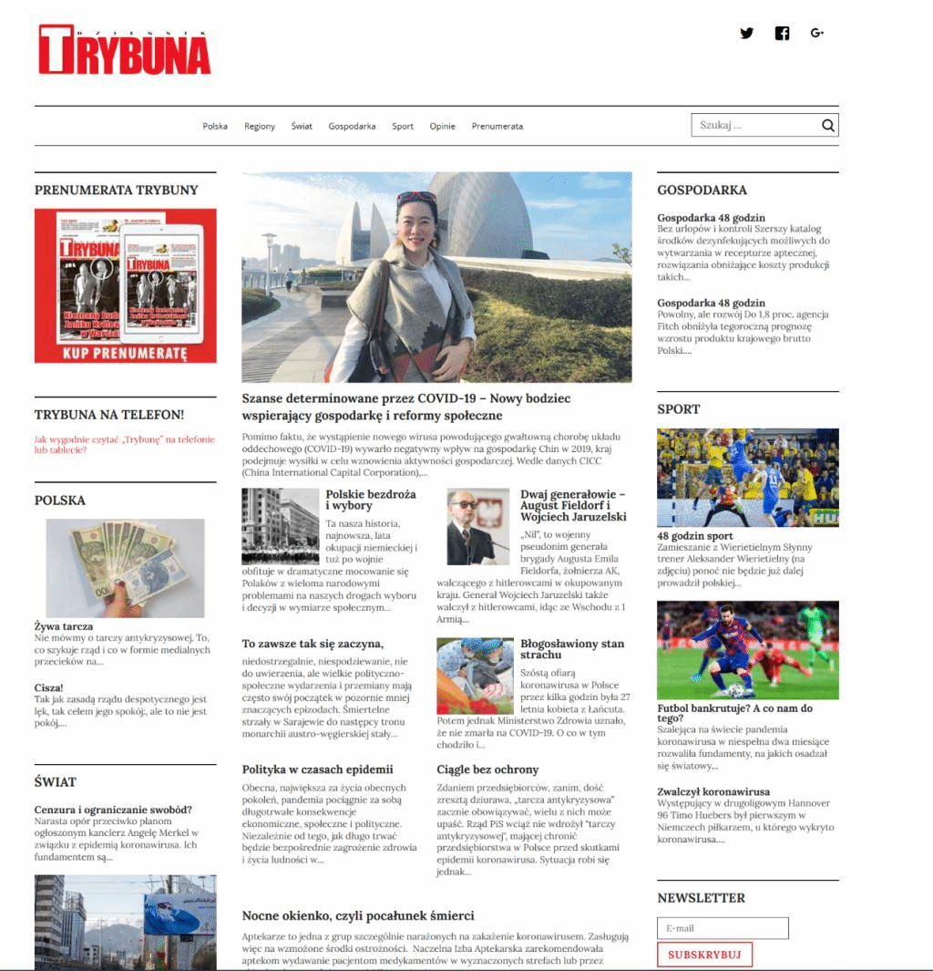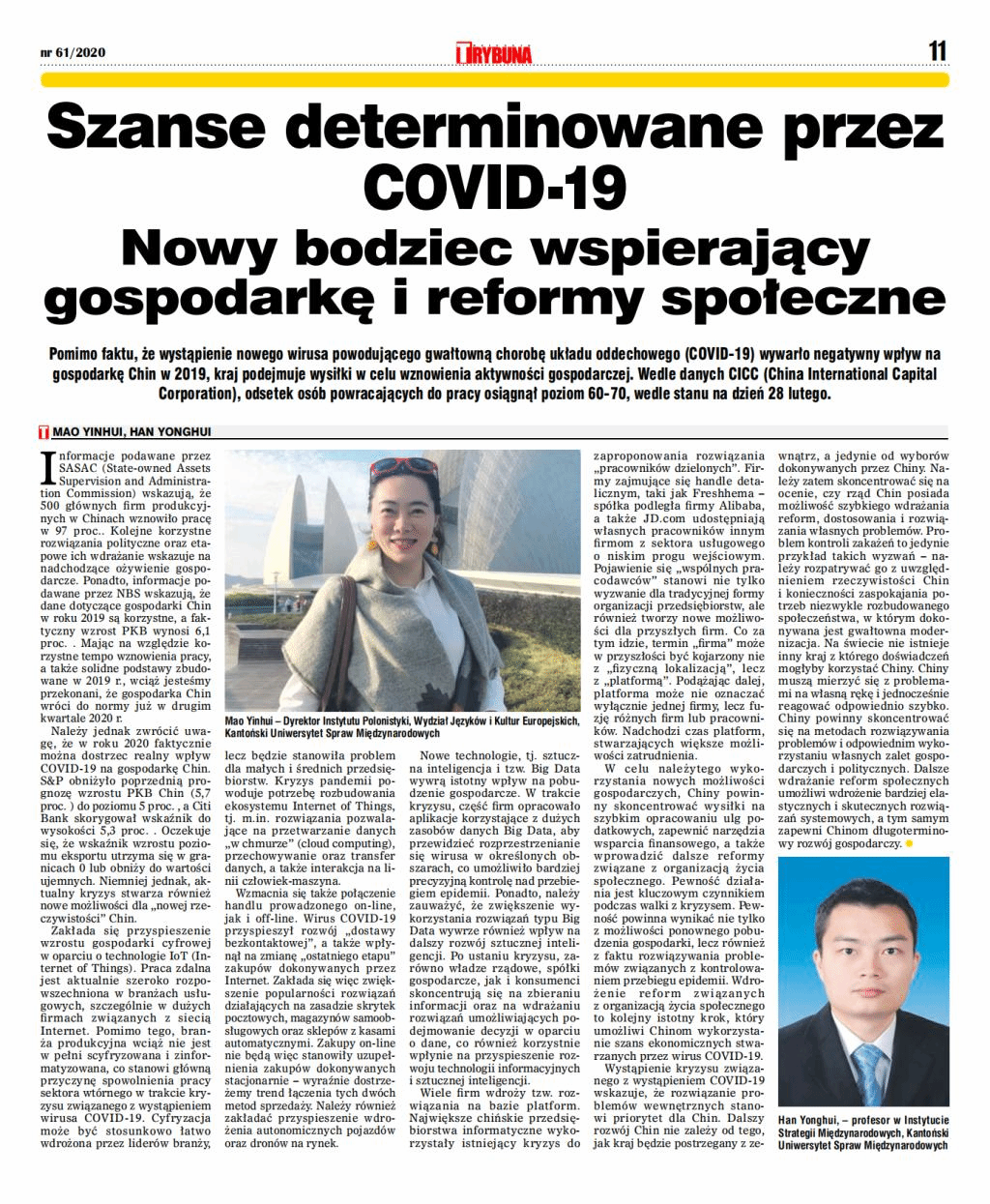 本网讯 3月27日,波兰主流媒体《论坛报》在专栏重要位置刊载了我校茅银辉、韩永辉两位教授的评论员文章——《新冠肺炎带来的机遇:新的经济增长动力和社会治理改革》。这是继2月28日中国驻波兰大使刘光源在该报发表题为《携手同心,共建人类命运共同体》的署名文章后,又一次向波兰社会传播和推广中国抗击疫情的理念与经验,展望疫情带来的挑战与机遇。当天的《论坛报》官网亦在首页头条位置做了推送链接。《人民日报》和CRI“国际在线”相继刊出报道。
