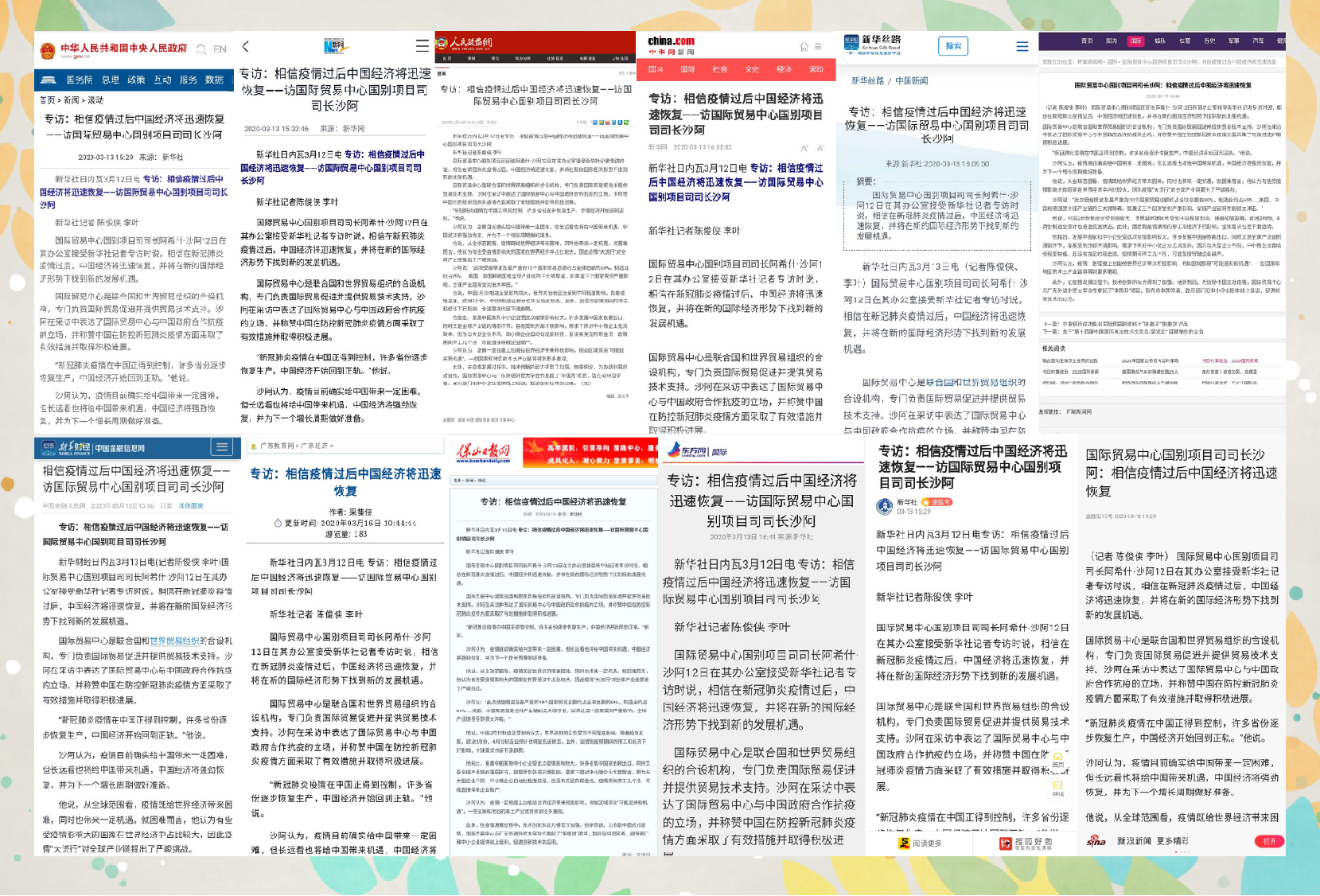 联合国国际贸易中心国别项目司司长沙阿接受新华社专访时表示,我校与ITC联合发起的“联合国国际贸易中心月”活动向中国学者、政府部门和中小企业提供线上培训,促进了创新技术的应用,助力疫情当下复工复产。专访得到中国政府网、中国政协网、中华网、新华丝路、环球新闻网等30多家权威媒体关注。