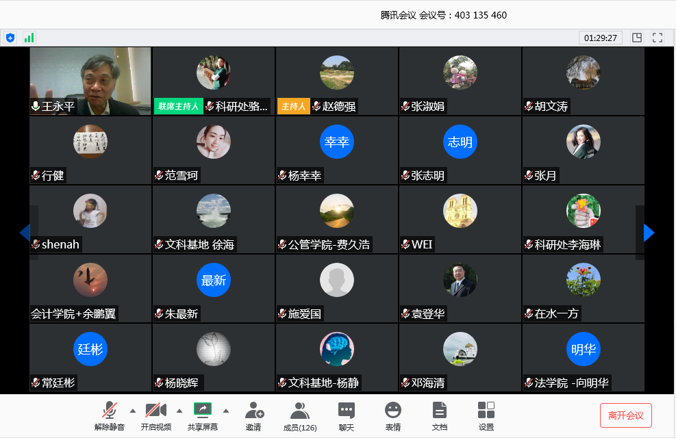 本网讯 4月16日上午,我校开展决策咨询报告撰写线上指导会。我校客座教授、《南方智库专报》主编王永平作“决策咨询报告选题与撰写工作”主题报告,校党委常委、副校长阳爱民,来自各学院、科研机构代表,校科研创新团队带头人,校决策咨询项目负责人、校应急项目负责人共126人共同参与研讨。
