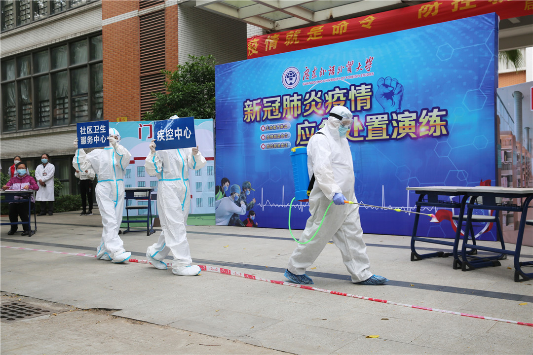 在演练过程中同时模拟及时逐级上报疫情、校地疫情联防联控、学校启动应急响应、排查隔离密切接触人员,启动使用隔离场所、对病例活动场所做终末消毒、加强校园防疫宣传和师生心理安抚等具体完整流程。在演练过程中,所有参演人员按照既定预案,反应迅速、配合密切、有条不紊地完成了应急处置模拟演练。