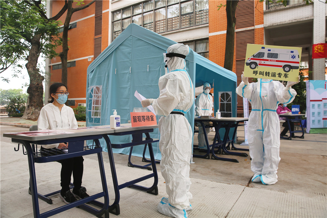 “辅导员您好,我们在课室上课,目前赵同学体温异常,现在要怎么处理?”应急处置模拟演练正式开始,班级学生干部发现学生有发热、咳嗽等不适症状后立即报告学院辅导员。校门诊部了解到相关情况启动应急预检分诊:医务室分诊护士对学生复测体温,并指导其填写《新冠肺炎疑似病例初步筛查表》,登记相关就诊资料。值班医生询问身体症状、接触史、旅居史、活动轨迹等情况,初步诊断为可疑疑似病例,遂通知属地医院出车接诊,同时做好活动轨迹、接触人员等相关登记。
