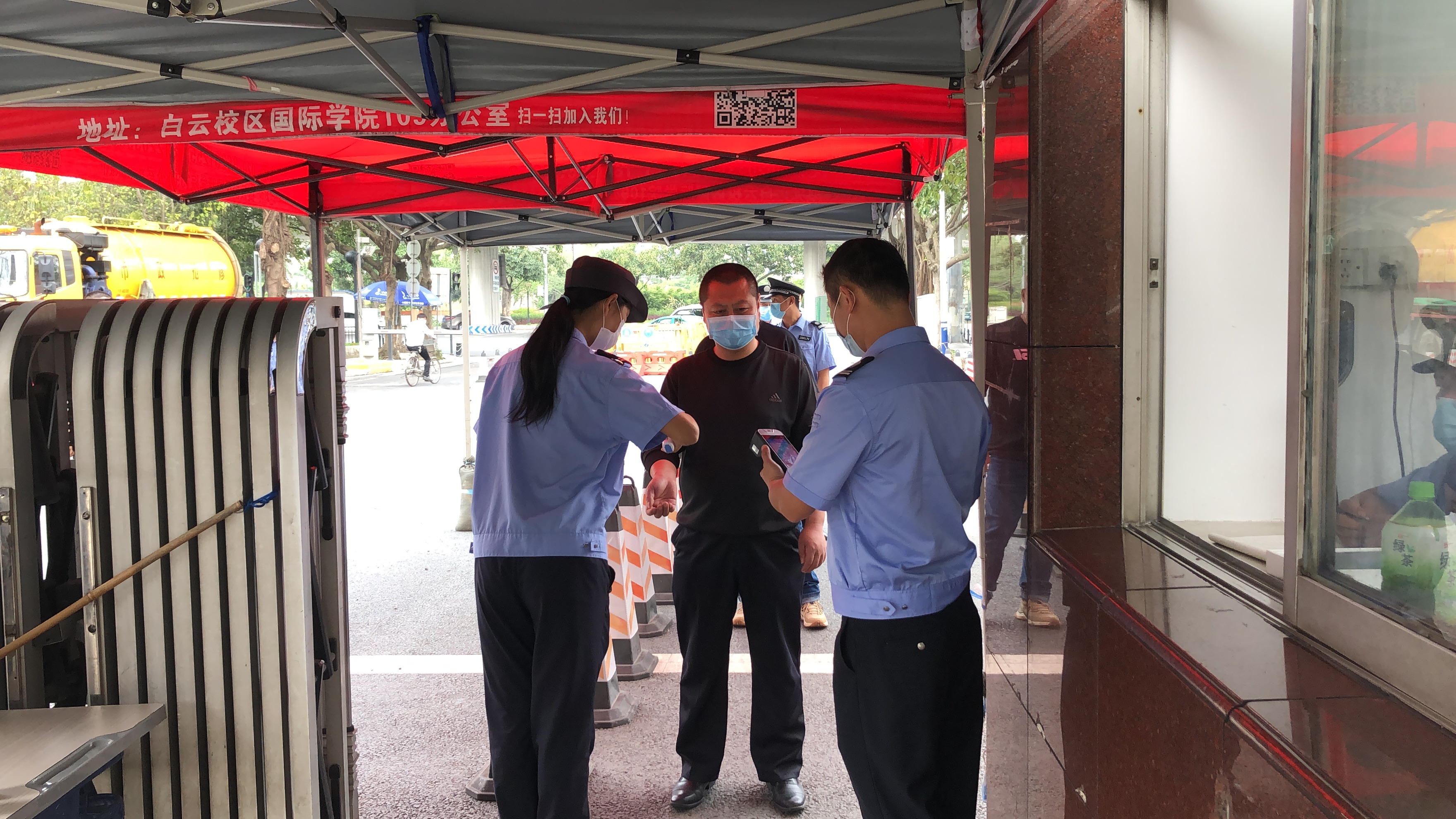 在安全保卫演练方面,分两部分内容进行:一是对进校师生进行测体温、验证,计算每个人进校所需时间; 二是对体温异常师生的紧急处置。