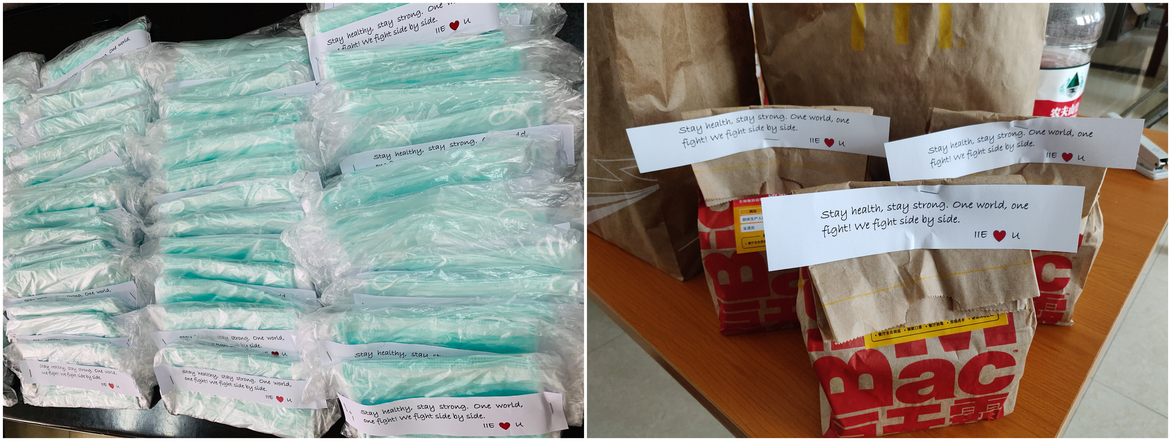 学校向全体在校留学生和宿管工作人员多次派发口罩、体温计和相关消毒用品,及时了解学生状况和需求并发放防疫物资,向在校接受居家健康服务的学生发放西式餐点爱心礼包,向在中国境内生活和坚持学习的291名留学生寄送口罩,“爱心行动”受到了留学生的热烈反馈和一致好评。