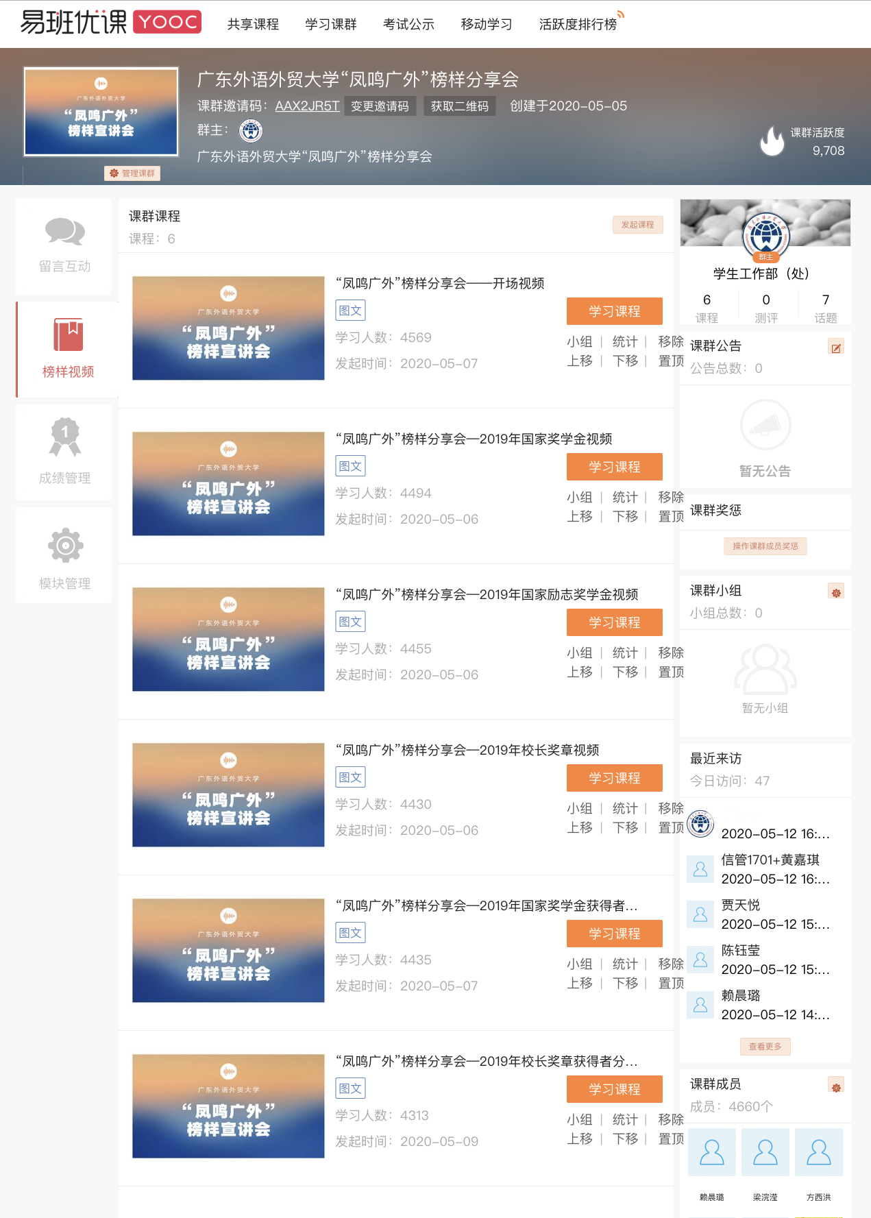 本网讯 为充分发挥优秀学生的先锋模范作用,特别在面对新冠肺炎疫情的特殊时期,培养学生的责任意识,激发爱国之情,培养感恩社会之情,激励广大学生成才报国,5月10日,学生工作部(处)通过广外易班优课平台组织“凤鸣广外”榜样分享会暨“爱国力行﹒青春榜样——榜样与你面对面”活动。国家奖学金获得者代表通过网络与5000余名学子分享学习与生活的心路历程,激励学子们努力奋进,勇担使命。