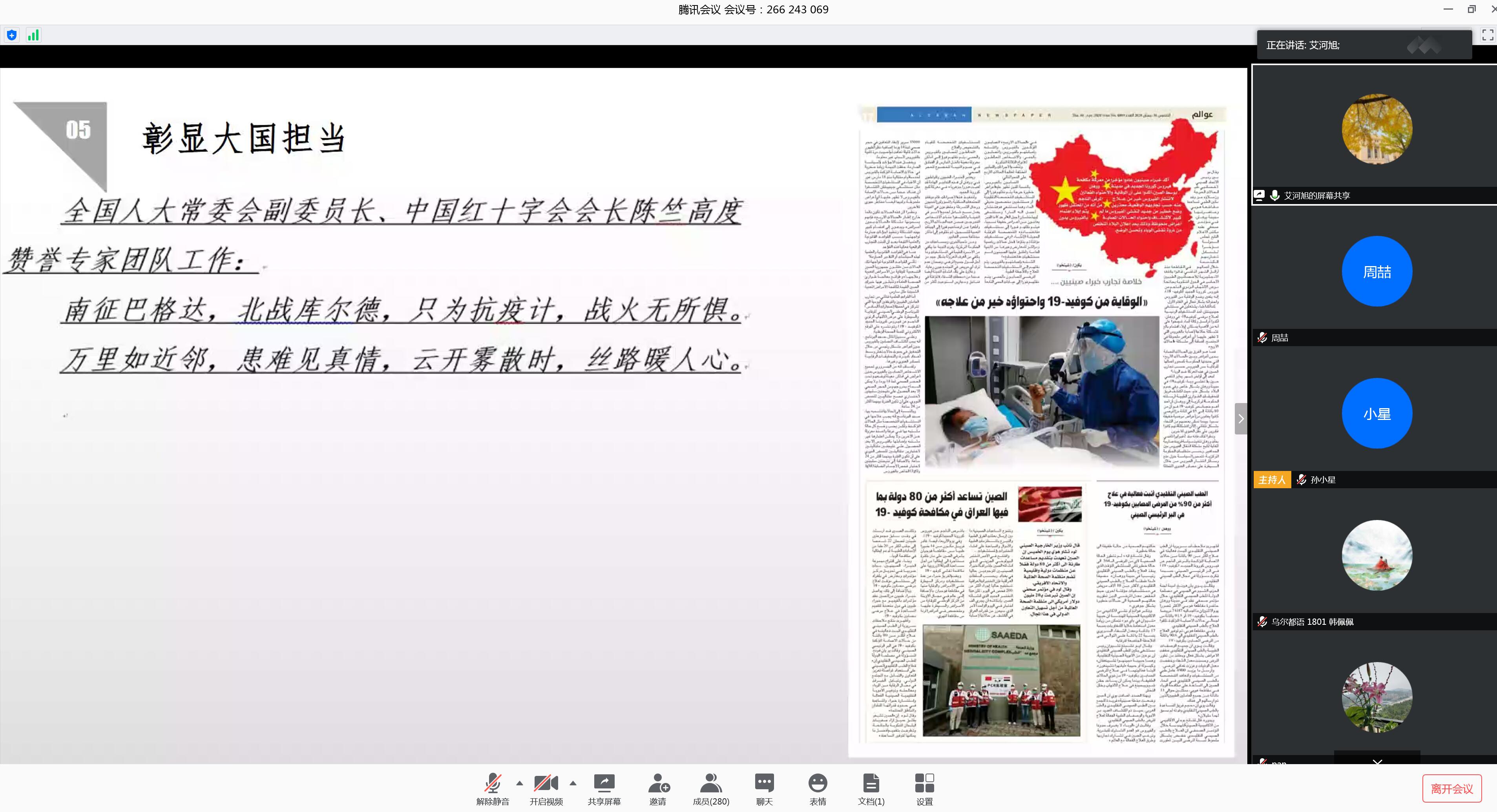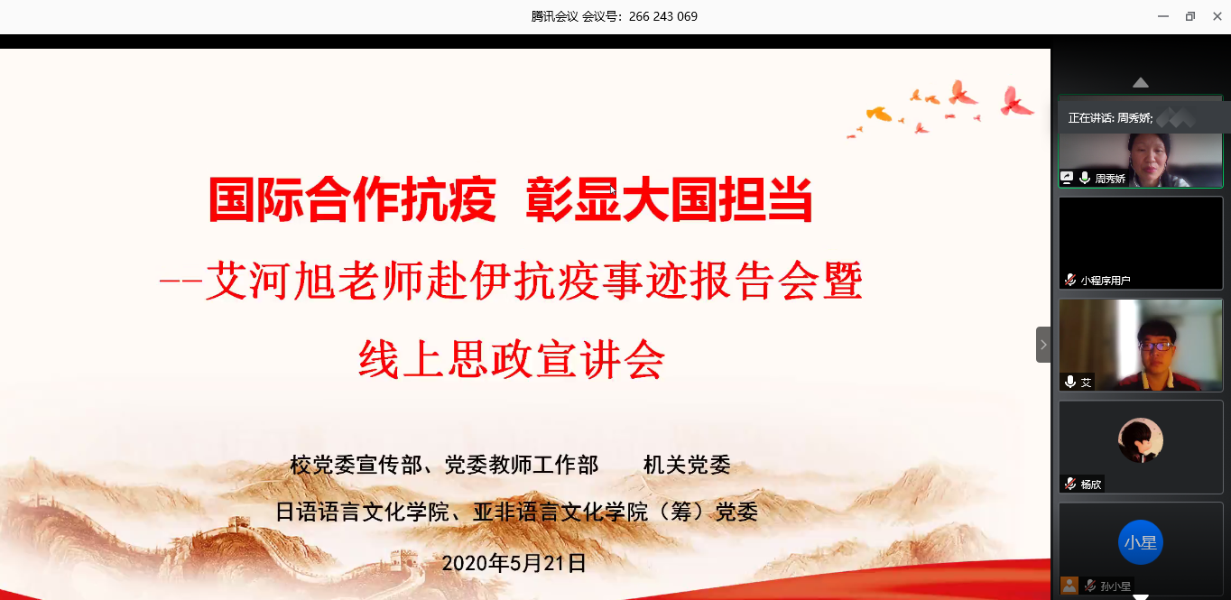 本网讯 5月21日下午,我校教师艾河旭赴伊抗疫事迹报告会暨线上思政宣讲线上举行,党委宣传部、党委教师工作部为艾河旭颁发思政宣讲团“国际合作抗疫彰显大国担当”专题特聘宣讲员证书。活动由党委宣传部、党委教师工作部,机关党委,日语语言文化学院、亚非语言文化学院(筹)党委主办,近300名师生党员参加线上活动。校党委常委、副校长王廷惠出席会议。