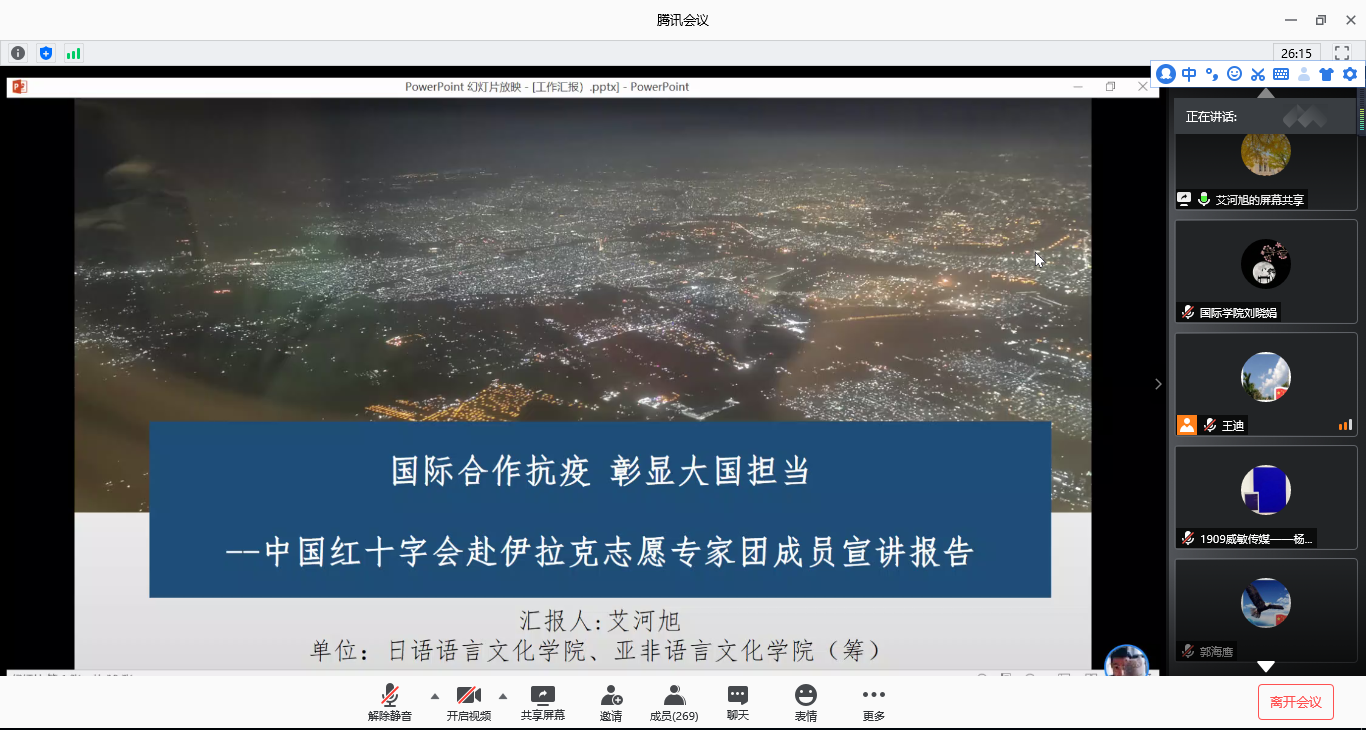 在中文学院和国际学院的宣讲中,艾河旭作为中国红十字会援助伊拉克防控疫情志愿专家组成员之一,介绍了专家团队克服重重困难远赴伊拉克援助抗疫的事迹,从我国的制度优势、理念优势、医疗优势以及领导优势四个维度分析疫情防控中的制胜法宝。援伊抗疫52天,专家团队共进行了18场官方会谈,开展了27次视频培训和面对面交流指导,培训本地医务人员近1000余人;8次到医学城综合医院及新冠肺炎定点医院科室进行临床指导,深入全国9个省区实地指导当地疫情防控工作,开展了15场中资企业员工的新冠肺炎知识讲座,直接受益人数达800人,远程视频覆盖达11000人。通过官方会谈、经验交流、临床指导、宣传倡导、设备支持等一系列措施,专家组的援助有效遏制了当地疫情的蔓延势头,稳定了中资企业人心,提振了员工士气,弘扬了红十字精神,彰显了中国理念,加深了中伊友谊。