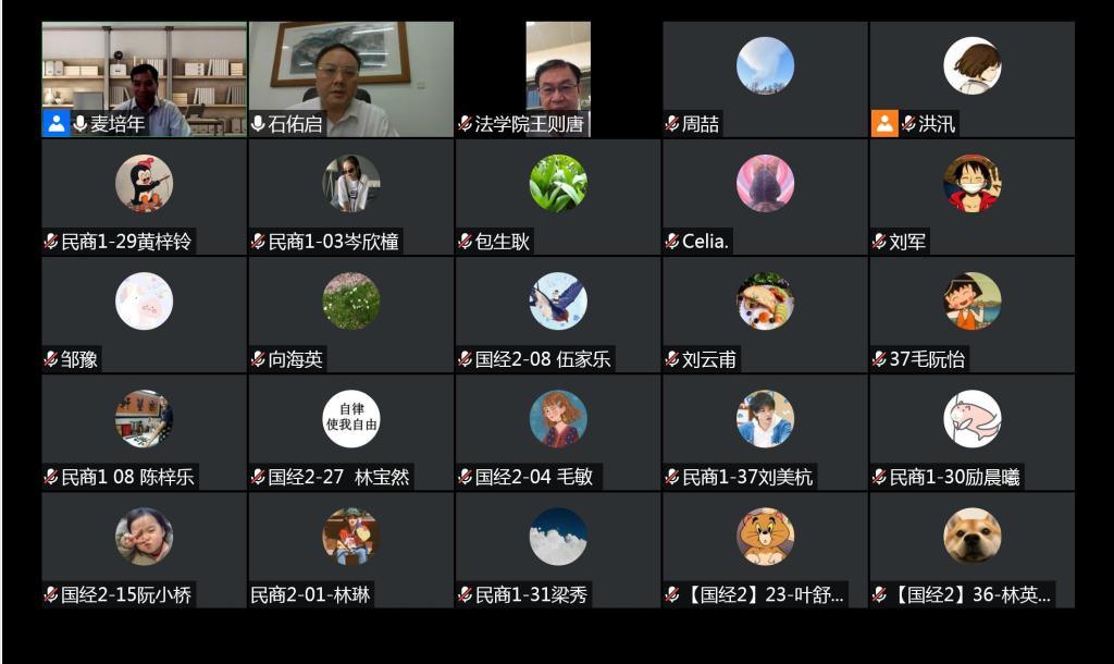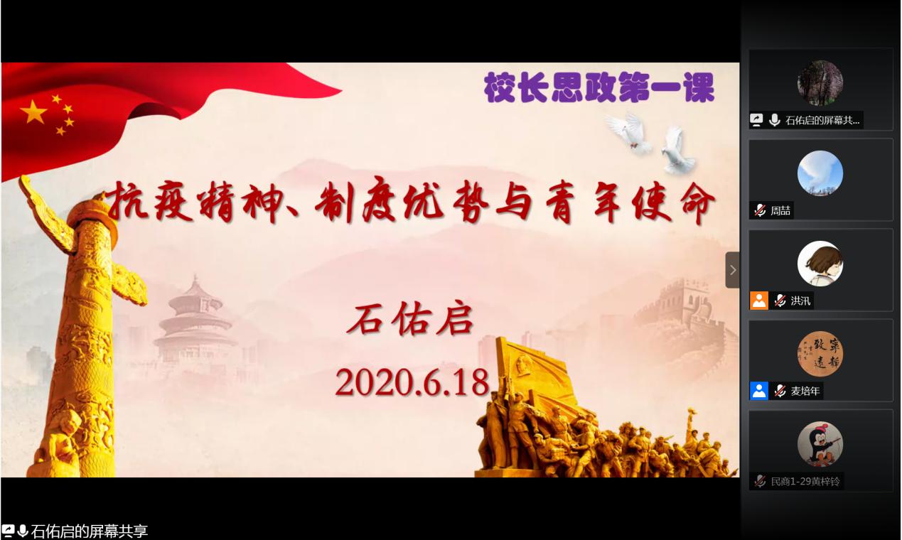 本网讯 6月18日下午,我校校长石佑启以“抗疫精神、制度优势与青年使命”为题,在线上为100多名法学院学子讲授了一堂生动的“思政第一课”。他结合当下我国抗“疫”新形势,寄语学子要担当起党和人民赋予的历史重任,在激扬青春、开拓人生、奉献社会的进程中书写无愧于时代的壮丽篇章,在实现中国梦的伟大实践中创造自己的精彩人生。