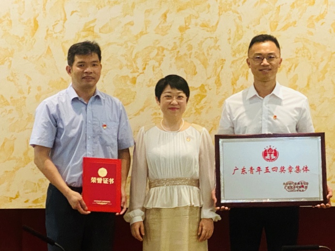 武一婷为多语言服务中心代表颁发“广东青年五四奖章”牌匾及证书
