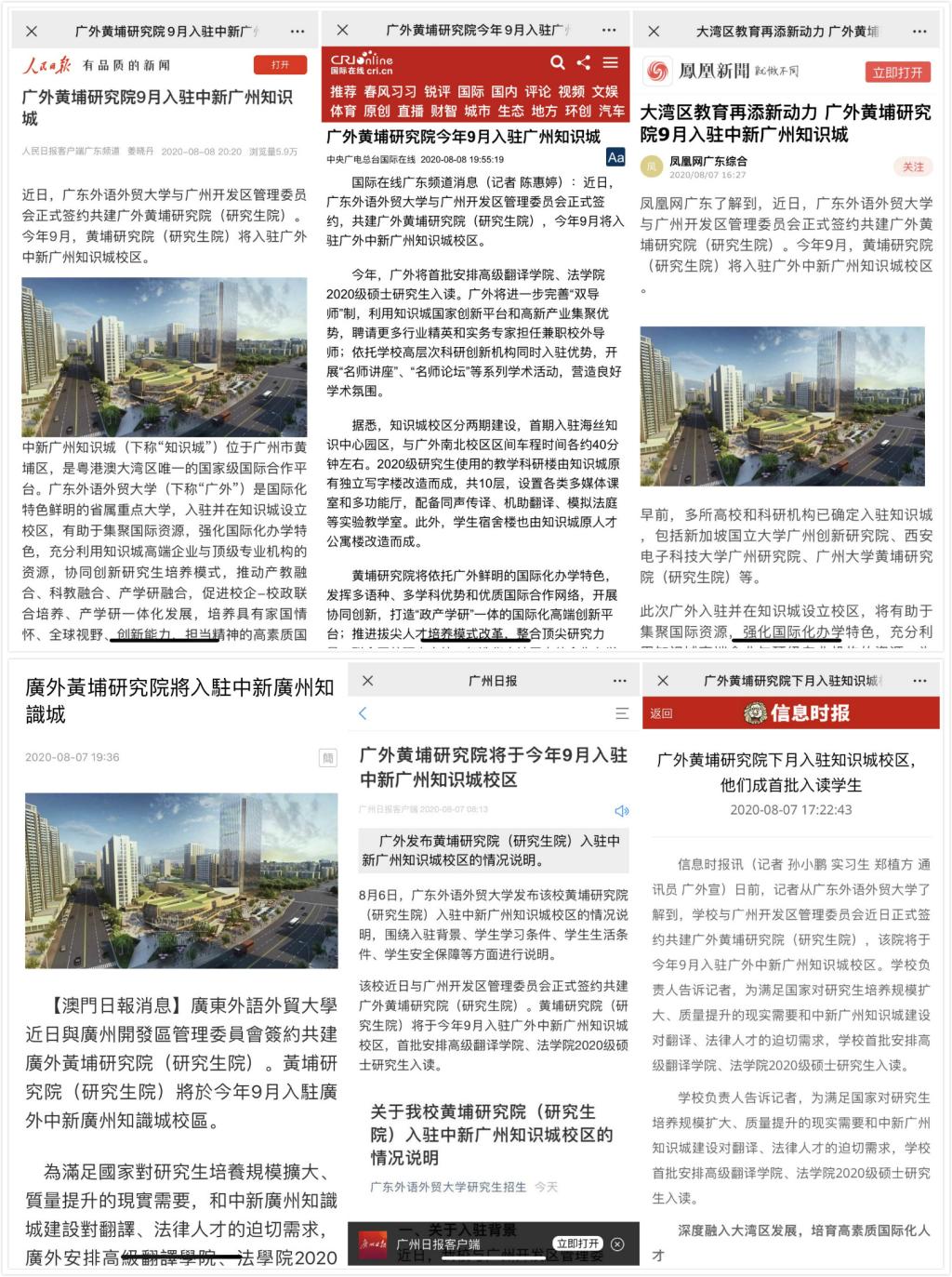 “大湾区教育再添新动力 广外黄埔研究院9月入驻中新广州知识城”。近日,我校与广州开发区管理委员会正式签约共建黄埔研究院(研究生院),消息受到中央和省市各大媒体的高度关注,人民日报、中央广播电视总台、凤凰网、澳门日报、羊城晚报、南方都市报、广州日报、信息时报等多家媒体持续报道,并力赞广外黄埔研究院(研究生院)入驻中新广州知识城,既是抢抓国家开放创新发展战略机遇的时代使命,也是主动深度融入粤港澳大湾区发展的时代责任。
