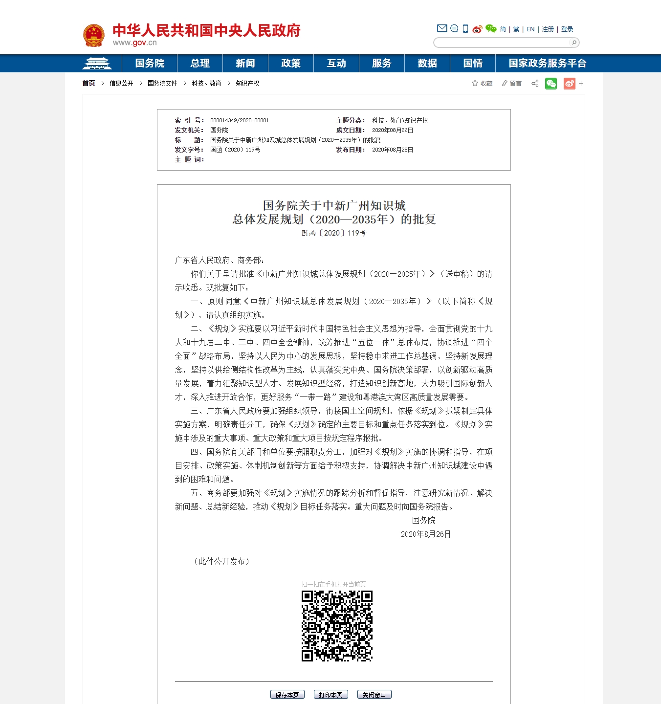 国务院关于中新广州知识城总体发展规划(2020—2035年)的批复