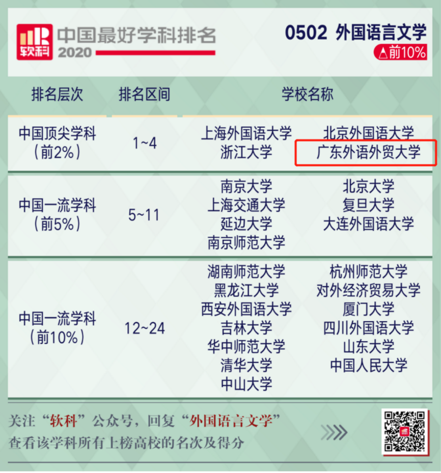 本网讯 近日,高等教育评价专业机构软科发布“2020软科中国最好学科排名”,我校外国语言文学上榜“中国顶尖学科”(排名前2%)。应用经济学、法学、新闻传播学排名前20%,另有6个学科位列学科排名前30%-50%。