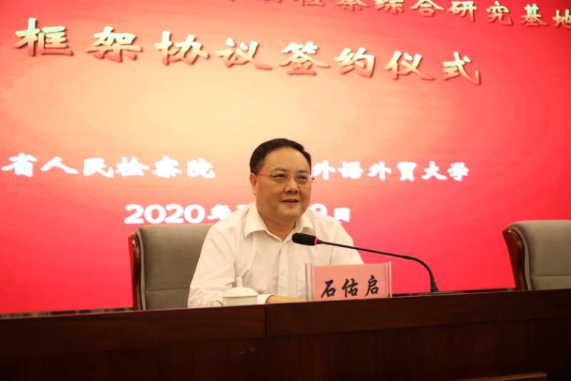石佑启对我校的发展概况、专业特色和教学理念进行了介绍,并就双方开展交流合作发展提出了意见。他表示,研究基地的设立是检察机关职能调整、业务转型和理念革新背景下推动检察理论创新发展的一项重要举措,对高等院校将理论研究和实践教学相结合,将优质实践资源引入高校具有重要意义。要高标准高质量建设综合研究基地,推动综合研究基地释放强大动能。一是建平台,打造检察理论研究与检察决策咨询的智库、制度实践创新的高地;二是强队伍,建成高水平检察干部队伍和高水平的师资队伍;三是育人才,给学生提供更多实践实习机会,增强学生的实践能力和创新能力,并为广东检察机关年轻干部的深造培养给予支持;四是出成果,聚焦实践中民事、行政、公益诉讼检察热点难点问题,在经典案例、调研报告编写等方面推出高显示度成果,反映检察实践成效;五是优服务,坚持问题导向,促进理论研究的成果转化和实践教学运用。