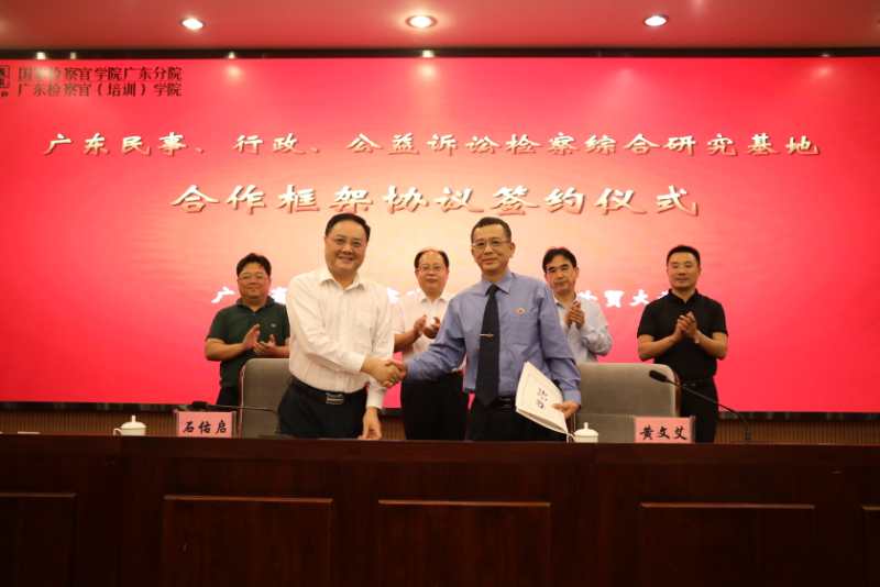 本网讯 10月19日下午,广东民事、行政、公益诉讼检察综合研究基地合作框架协议签约仪式在国家检察官学院广东分院举行,最高人民检察院第七检察厅厅长张相军莅临现场见证仪式。我校校长石佑启、广东省人民检察院副检察长黄文艾出席仪式。