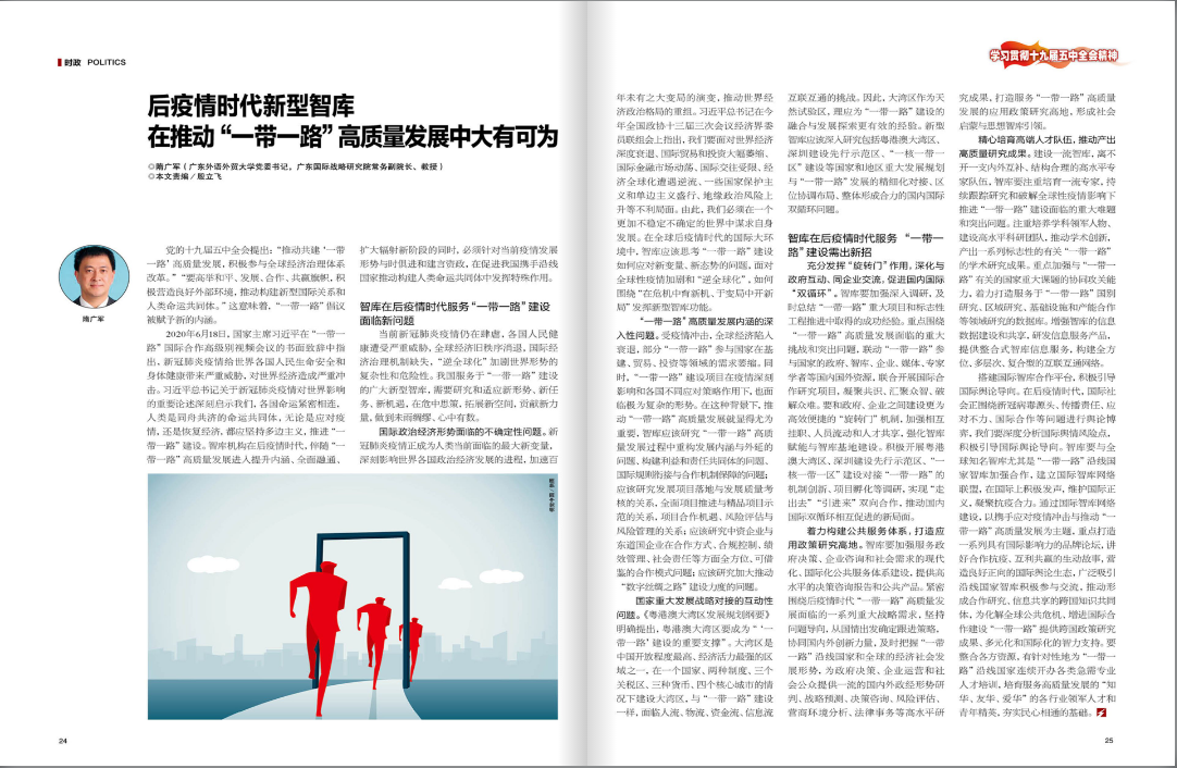 本网讯 近日,我校党委书记、广东国际战略研究院常务副院长隋广军教授理论文章《后疫情时代新型智库在推动“一带一路”高质量发展中大有可为》在《南方》刊登,文章从党的十九届五中全会提出的“推动共建‘一带一路’高质量发展,积极参与全球经济治理体系改革”切入,重点剖析了智库在后疫情时代服务“一带一路”建设面临的新问题与新对策。