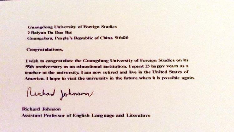 曾经在我校英语语言文化学院工作了23载的外教理查德·约翰逊专程发来贺信祝贺我校55周年庆,并表达了在不久的将来相聚广外的期待,希望有机会能回到白云山下,漫步相思河畔,看白云山青,碧溪水蓝,听书声琅琅,鸟语悠扬。