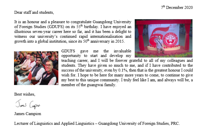 “很荣幸能够见证广外持续快速的国际化进程,见证广外成长为国际性机构。”英语语言文化学院外教詹姆斯·坎皮恩在贺信中如是说。他还表示感谢广外给予他在高校工作的机会,提供给他开展教育事业的平台。信件中一词一句都流露出对广外的感恩之情。