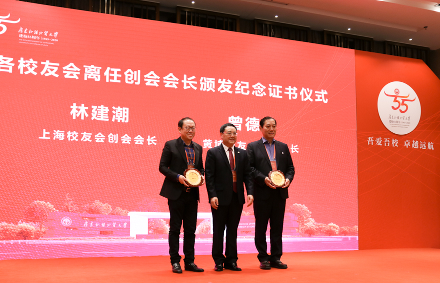 校友会的蓬勃发展,离不开一批先驱者的无私奉献。为感谢他们对校友工作做出的突出贡献,大会由石佑启向已离任的上海校友会创会会长林建潮、黄埔校友会创会会长曾德祥颁发纪念证书。