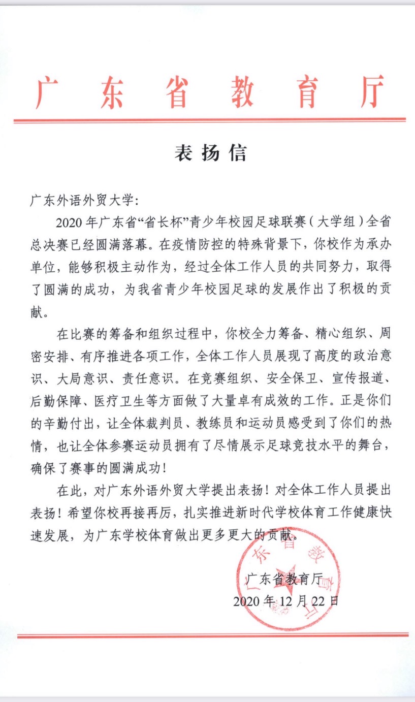 本网讯 近日,广东省教育厅向我校发来表扬信,对我校在承办2020年广东省“省长杯”青少年校园足球联赛(大学组)全省总决赛中所作的积极贡献表示肯定,对全体工作人员的努力工作表示认可。