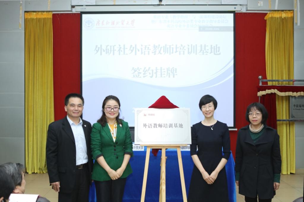 本网讯 12月26日,在英语专业《教学指南》与一流课程建设论坛暨广东省本科高校外语类专业教学指导委员会英语专业分委员会2020年会上,我校英语语言文化学院举行了“李筱菊外语教师发展中心”落成以及“外研社外语教师培训基地”签约挂牌仪式。北京外国语大学副校长孙有中、我校副校长焦方太,李筱菊家属代表出席仪式。